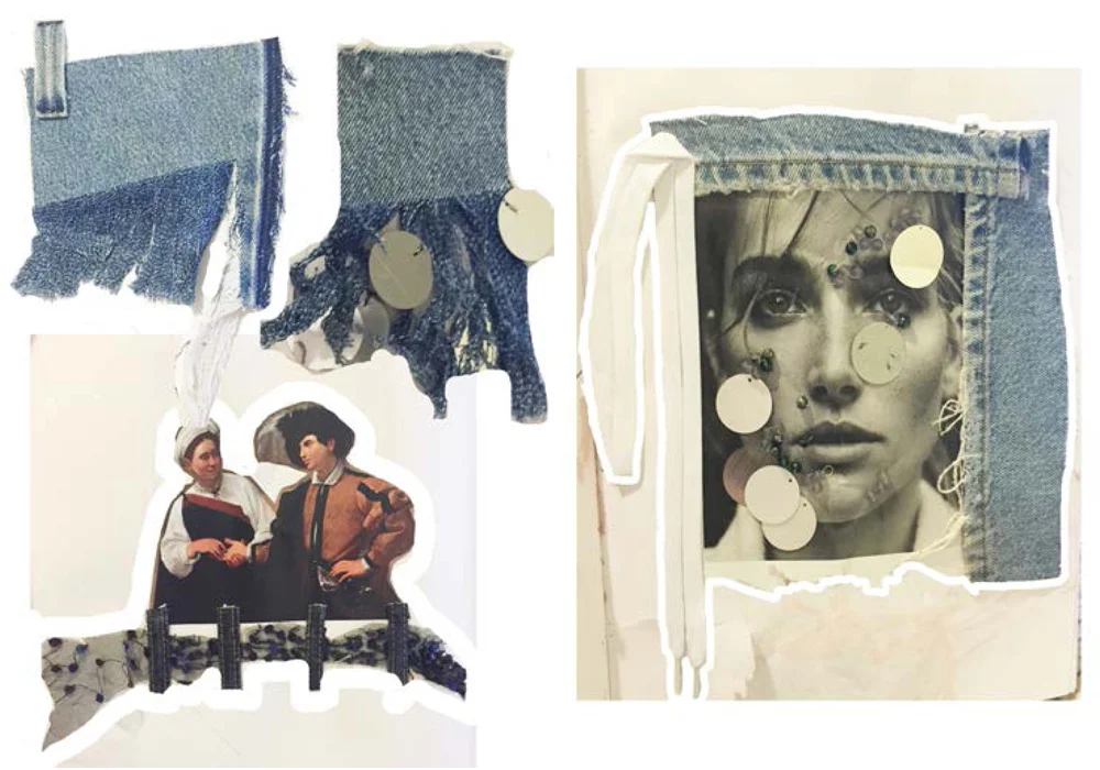 Repurposed jeans turned into denim toga with Italy map embroidery.